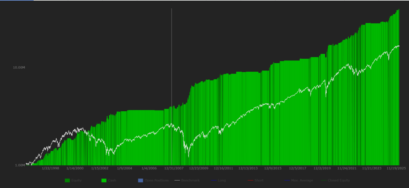 This system outperformed the SPY benchmark while being in the market less than one day in five. The other 83% of the time it was sitting in cash, completely out of the way of whatever else you are doing.